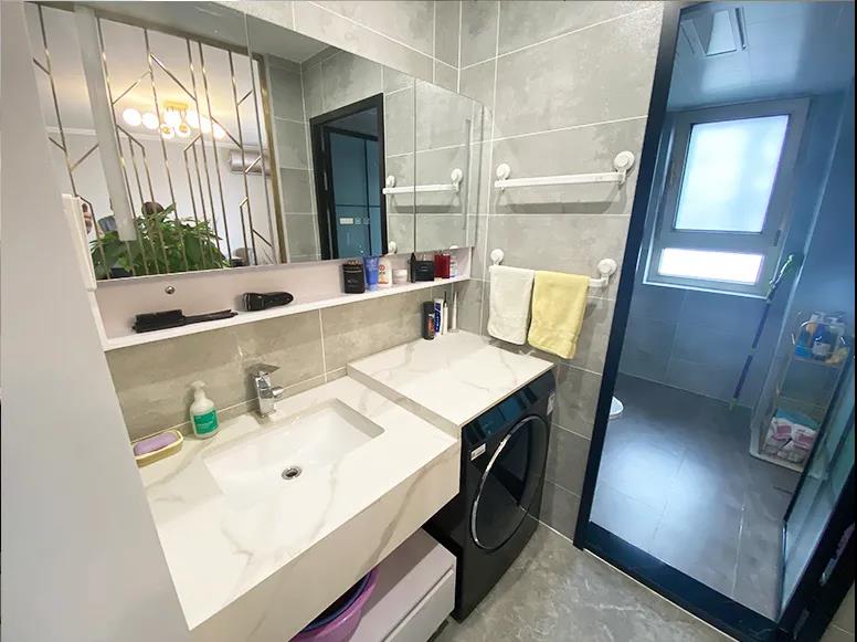 干區(qū)實(shí)現(xiàn)洗衣、洗漱雙重功能,定制浴室柜使墻面、臺面、臺下都得到了充分的利用,增加了儲物空間。將原有到頂?shù)倪@面墻體進(jìn)行了拆除,改為半高矮墻,利用金屬窗進(jìn)行了鏤空處理,整個(gè)空間采光充足、視野開闊、動線合理。