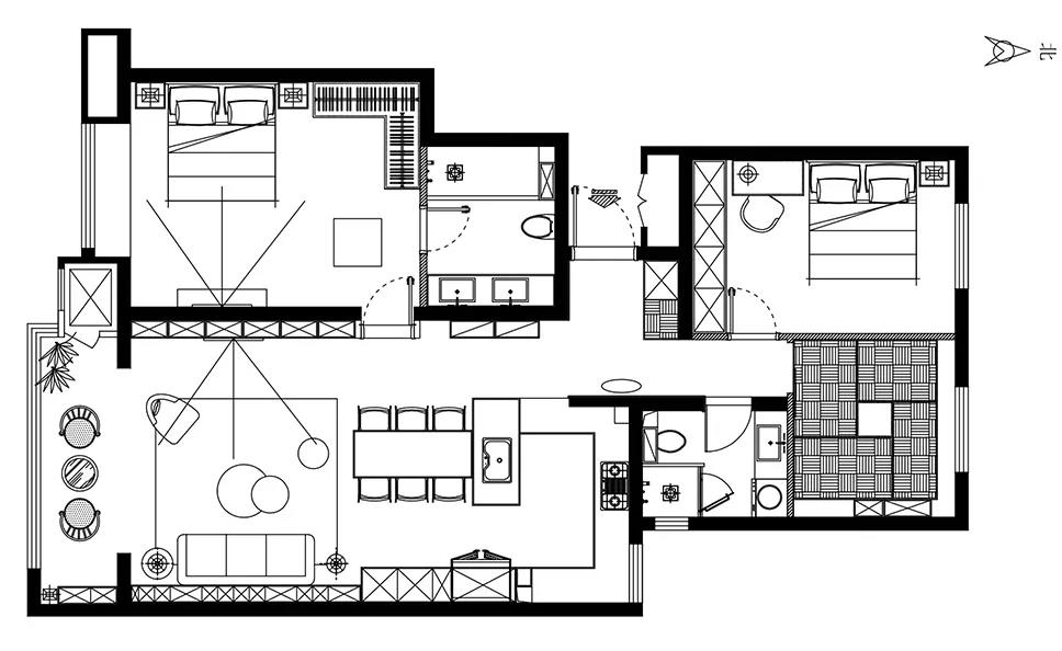 設(shè)計師客廳和陽臺的推拉門拆除,將陽臺區(qū)域納入到客廳里,改造后的客廳與過道、廚房、餐區(qū)、陽臺形成了一個大的開放空間,整體空間達到了56平米,徹底實現(xiàn)了王先生想要的開闊式客廳。沙發(fā)、茶幾依次擺放,設(shè)計師利用定制家具為業(yè)主打造了電視柜和客廳儲物柜,有藏有露,實現(xiàn)了一家人想要的大容量儲物。陽臺則打造成休閑區(qū),與朋友喝茶、聊天的同時,欣賞窗外的美景,公共區(qū)域整體空間大氣、溫馨、舒適。