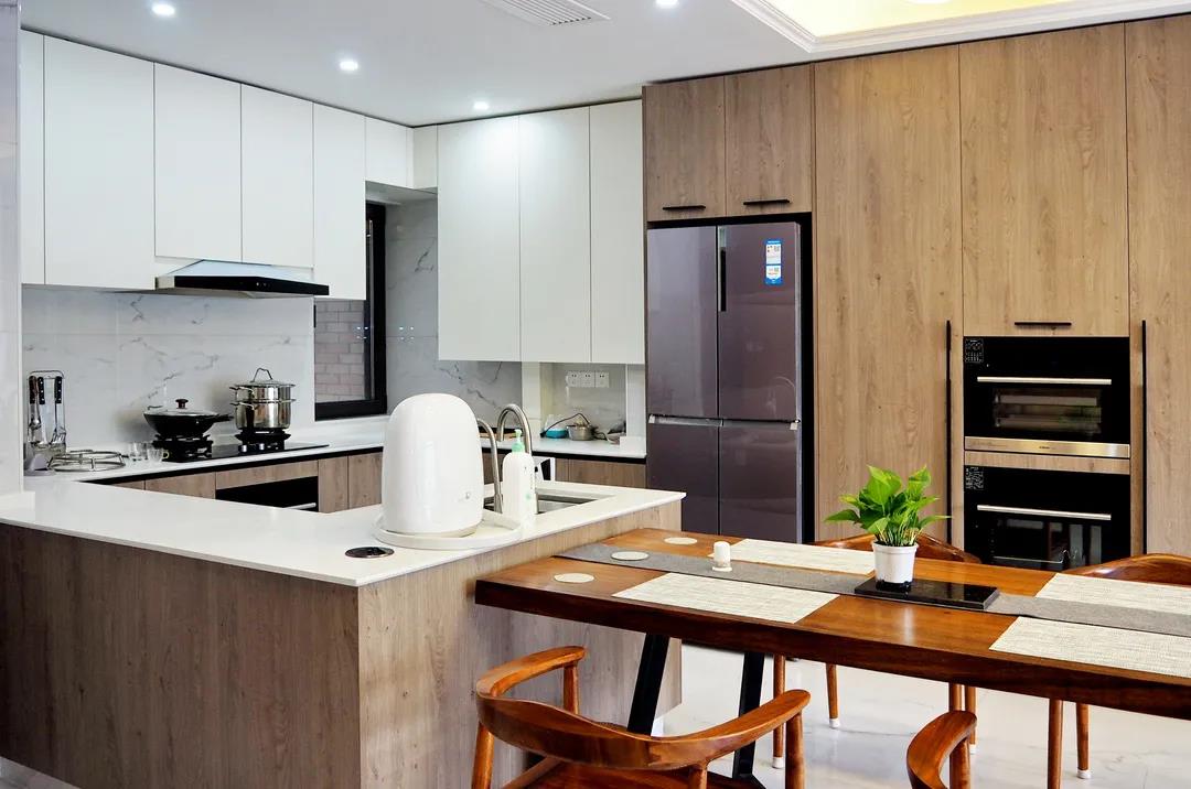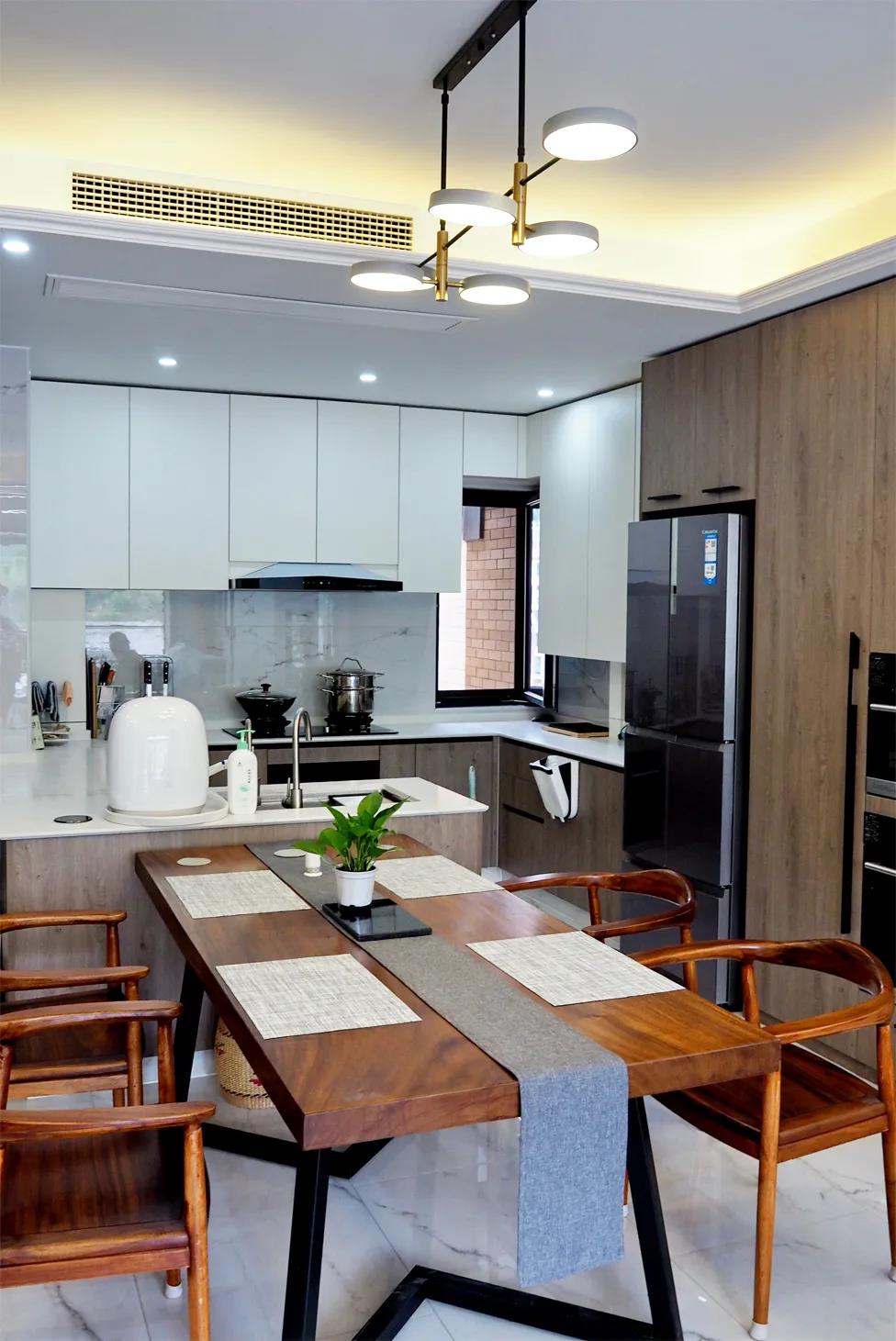 設(shè)計師拆除了廚房的兩面輕體墻,將封閉式廚房改為開放式。一組G字型櫥柜,洗切超動線合理,超大的臺面設(shè)計,滿足了王先生操作的同時,還能擺放下不少的小家電,觸碰式升降電源的設(shè)計讓廚房更顯科技感。再配合大容量吊柜、地柜和電器儲物柜,設(shè)計師將儲物空間做到了極致,餐區(qū)沿著洗手臺將用餐區(qū)域擺放在這里,做飯的同時還能與餐區(qū)進行無障礙互動,整體家庭氛圍更加融洽、和諧。