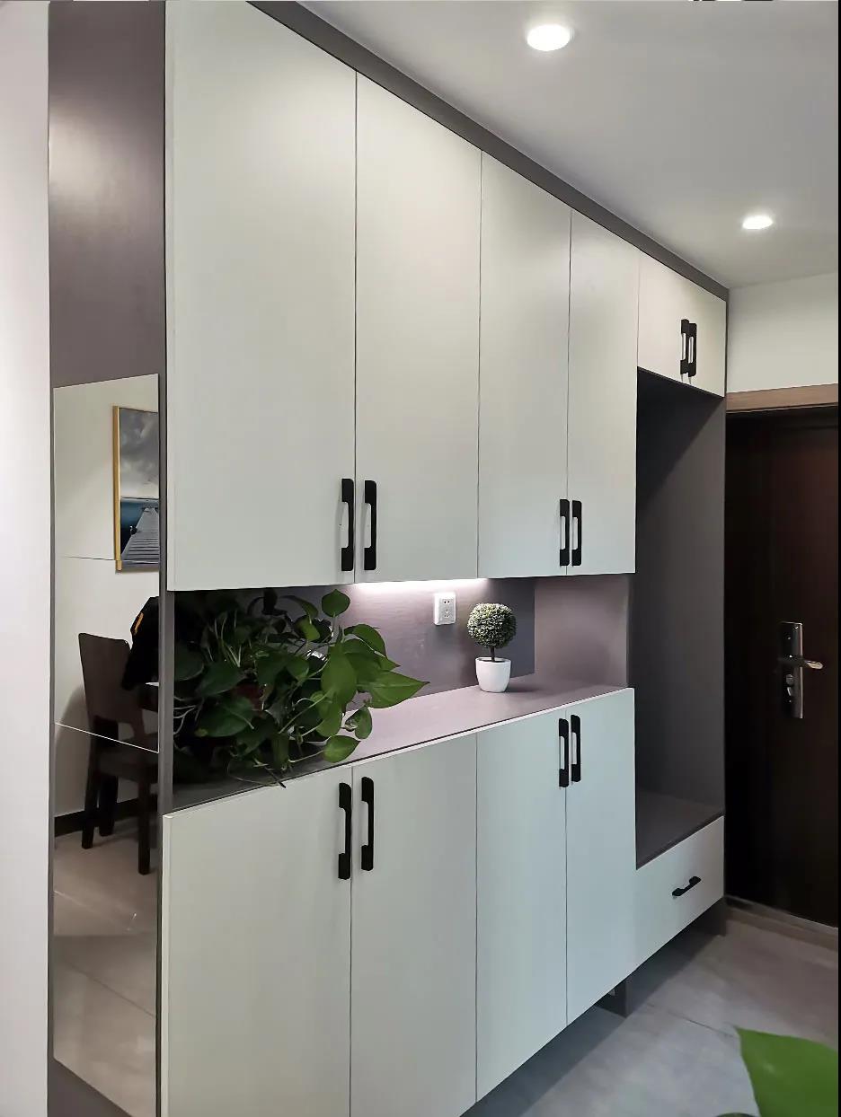 進門右手邊,設計師規(guī)劃了一組通頂鞋帽柜,增加了門廳儲物空間,卡座的設置方便了日常坐著換鞋,考慮到未來可能有輪椅的出入,設計師特意將鞋帽柜的厚度設計為35厘米,既為過道留出了更多空間,也能夠滿足日常鞋子的存放。