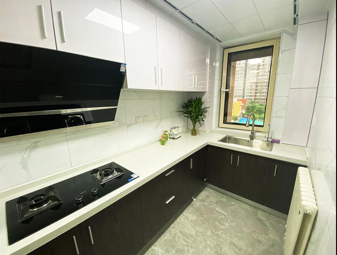 設(shè)計師封堵原有廚房門洞后,用定制家具代替隔斷墻,同時將廚房門改在另一側(cè),并且采用了節(jié)省空間的鋁合金推拉門。為廚房里節(jié)省了不少空間。將雙開門冰箱嵌入原有的門洞內(nèi),一組L形櫥柜,滿足大容量儲物的同時,還增加了不少操作空間。