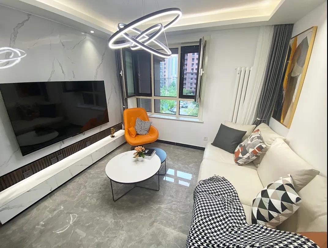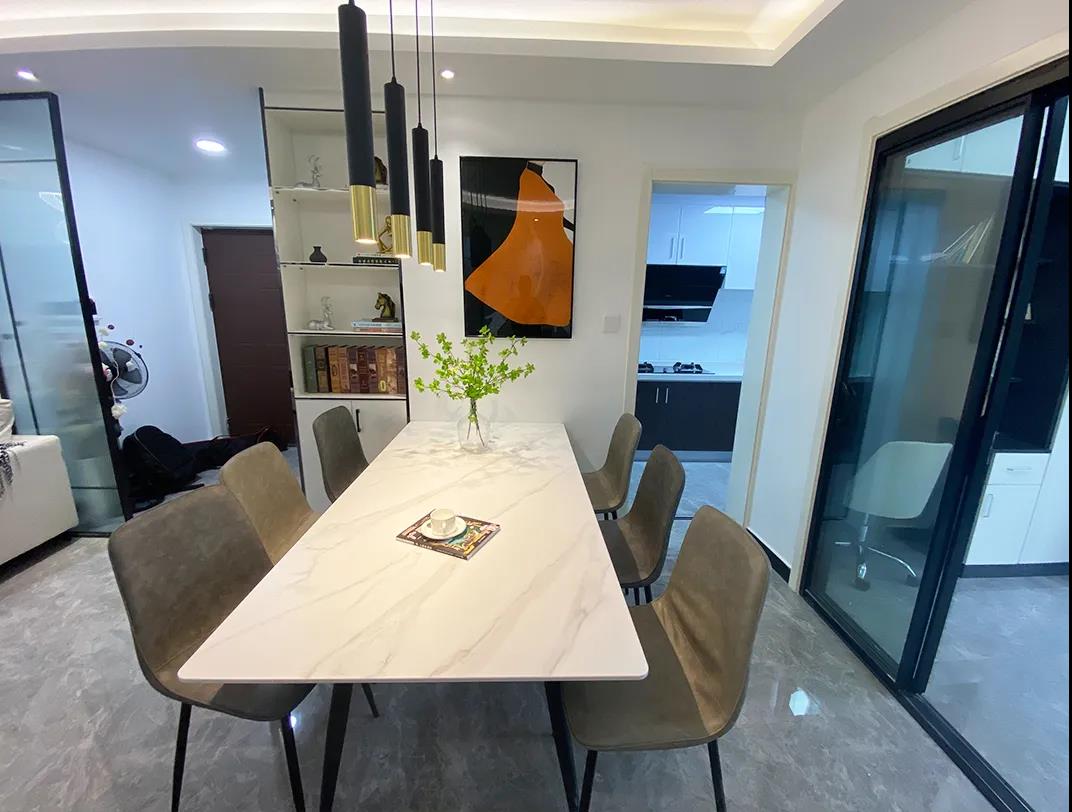 設(shè)計師將原有次臥與客廳相鄰的輕體墻向臥室方向挪動了80厘米,客廳從22平米擴(kuò)大到25平米,沙發(fā)、茶幾、電視柜依次擺放。同時,在這里規(guī)劃了用餐區(qū)域,1.8米乘以90厘米的多人位巖板餐桌,滿足趙女士親戚朋友來家聚會的需求,借助玄關(guān)柜的側(cè)面,設(shè)計師也為餐區(qū)進(jìn)行了餐邊柜的設(shè)計,改造后的餐客廳,通透、明亮。
