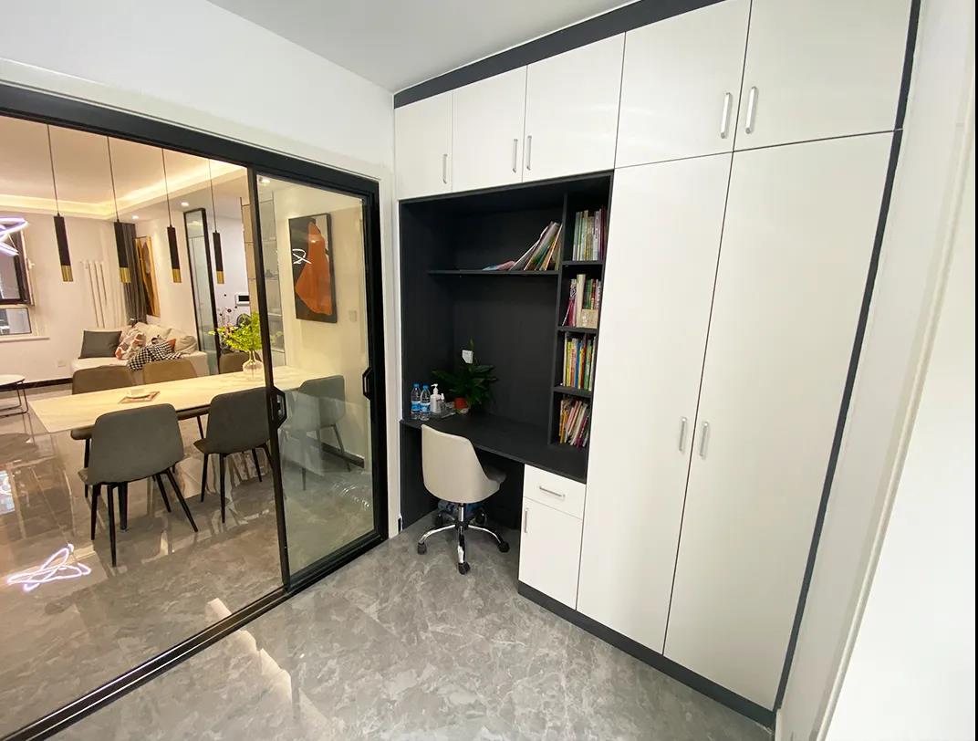 將原本次臥面積借給了客廳,打造了餐區(qū)。次臥被規(guī)劃成了書房,推拉門的設(shè)計節(jié)省了空間,也給客廳增加了采光面。利用潤元的定制家具,打造了一組多功能通頂儲物柜,實現(xiàn)工作、儲物兩不誤。雙人位沙發(fā)床讓整個空間還可以作臨時客房來使用。