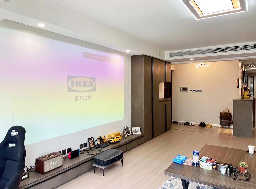 設(shè)計師封堵了主臥門洞,將臥室門改在異形陽臺施工洞位置,使客廳整體空間更好布局。將沙發(fā)墻進(jìn)行調(diào)整,移到了對面位置,隱藏式幕布滿足了業(yè)主自由式觀影方式,隱藏式窗簾使空間更加簡約,同時也最大限度的增加了客廳的采光面,調(diào)整布局后,業(yè)主職業(yè)需要的賽車模擬器也有了充足的空間。