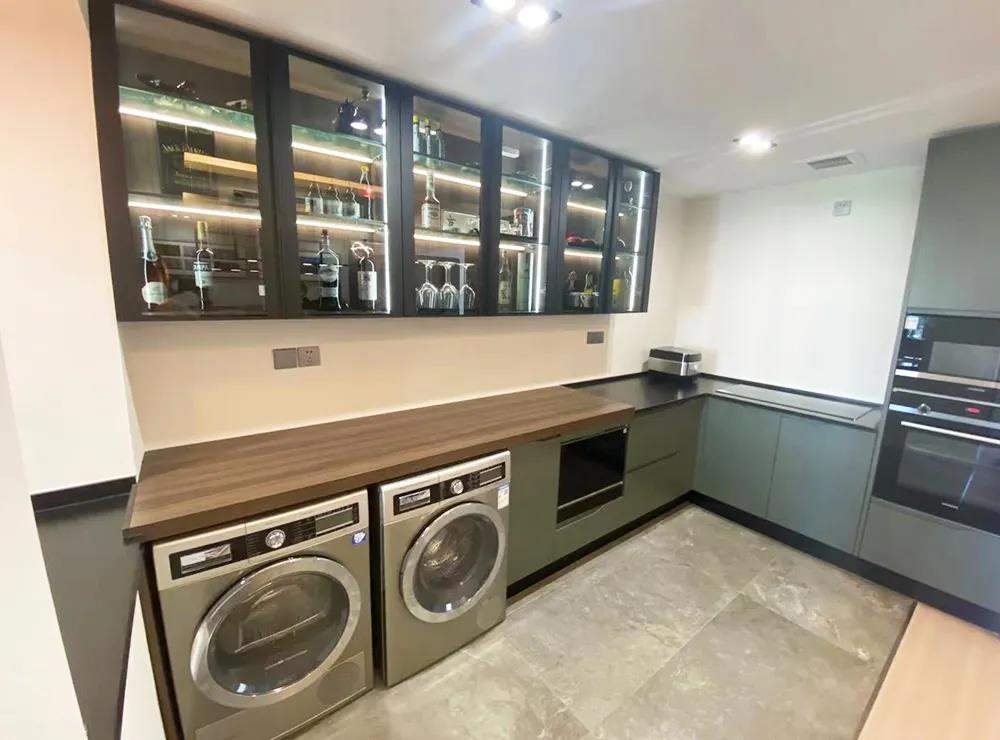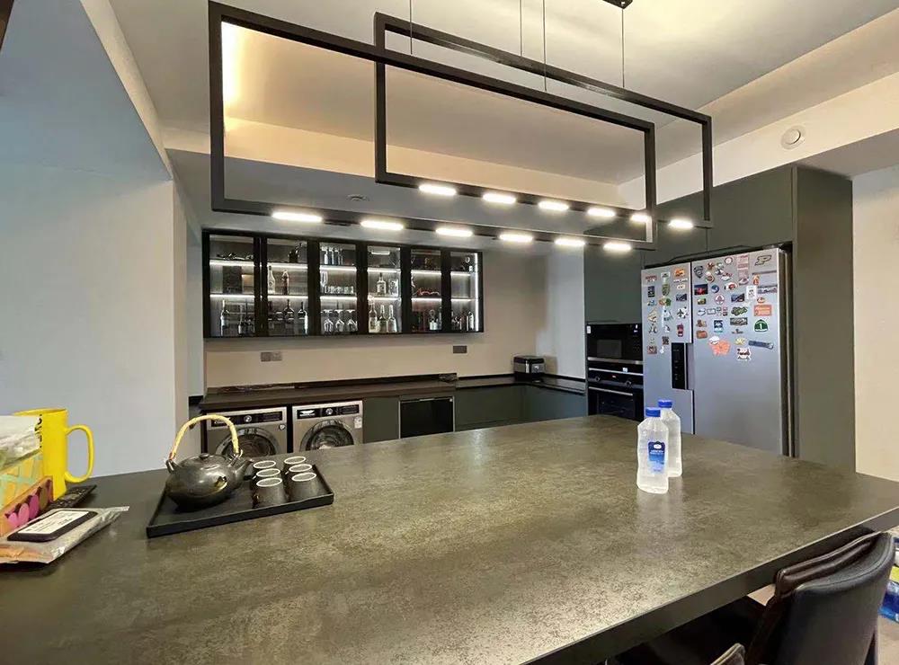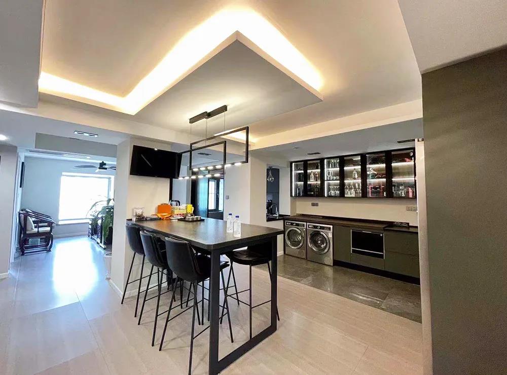 整個餐廚空間,設(shè)計師規(guī)劃了中廚、西廚和吧臺。6平米的西廚,一組定制的L型櫥柜,超大臺面滿足了烹飪和儲物等需求,柜體內(nèi)嵌洗衣機、烘干機、蒸箱、烤箱、微波爐,整體空間干凈美觀,使用方便。