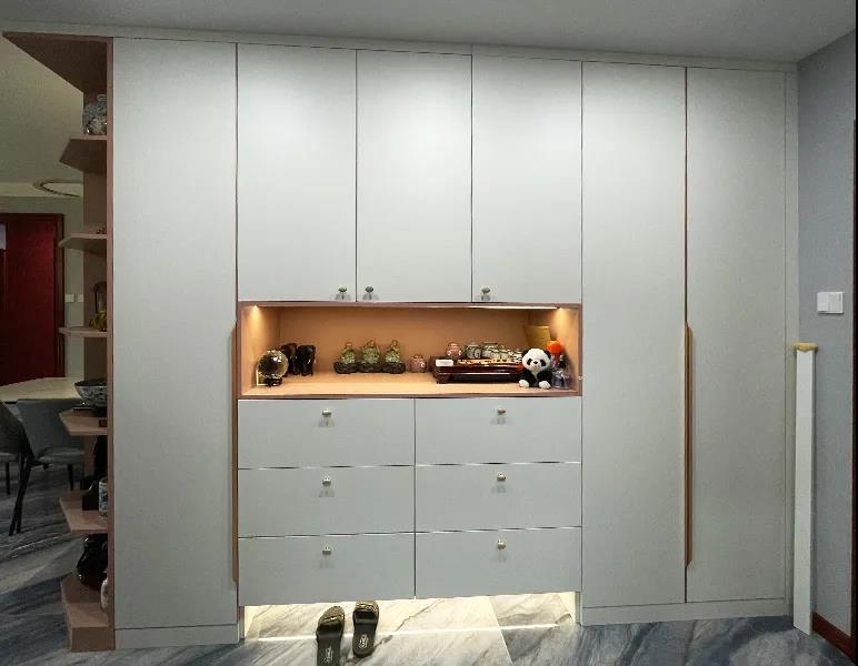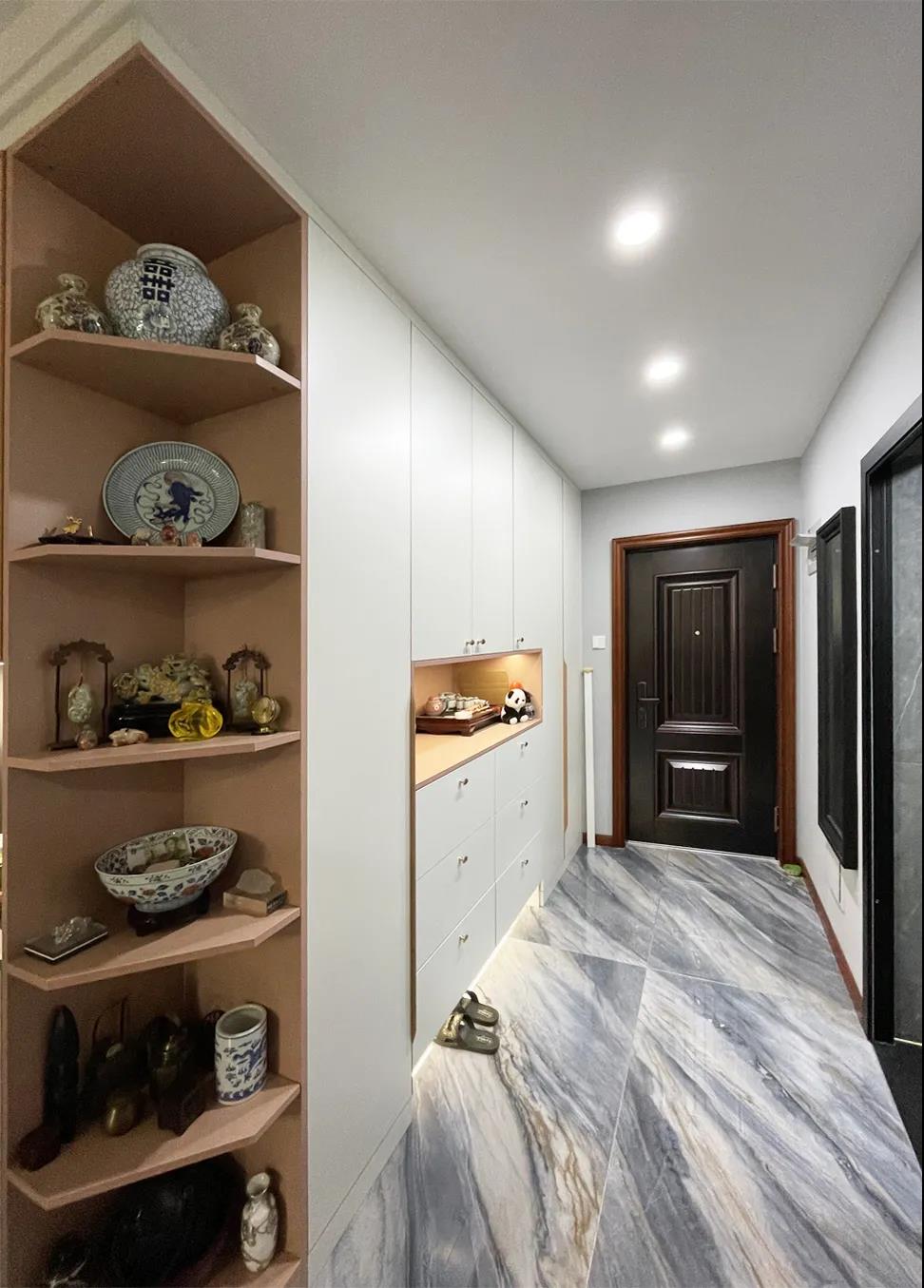 設(shè)計(jì)師在入戶空間利用定制家具,為業(yè)主打造了一面通頂定制鞋帽柜??拷霊舻奈恢靡?guī)劃為了旋轉(zhuǎn)式鞋柜,鞋帽柜中段進(jìn)行了上中下三段式設(shè)計(jì),便于分類存儲(chǔ)各類日常用品,鞋帽柜的左邊規(guī)劃為了長衣區(qū)。整體衣帽柜粉色和白色相結(jié)合更顯年輕與活力,頂面隱藏式筒燈的設(shè)計(jì)使空間更加明亮?xí)r尚。
