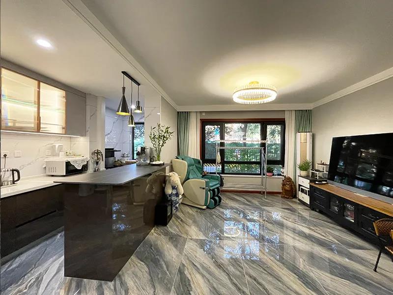 結(jié)合兩位老人的飲食習(xí)慣,設(shè)計(jì)師將封閉廚房打造成開放式廚房,與客廳空間進(jìn)行融合,視野更加開闊。利用巖板打造的大容量島臺(tái),讓廚房空間更加時(shí)尚、前衛(wèi)。