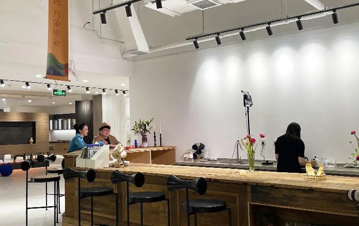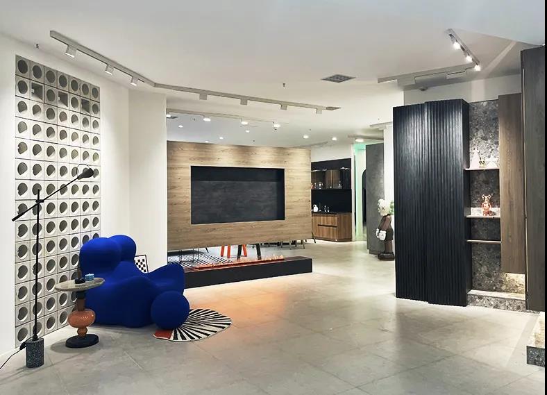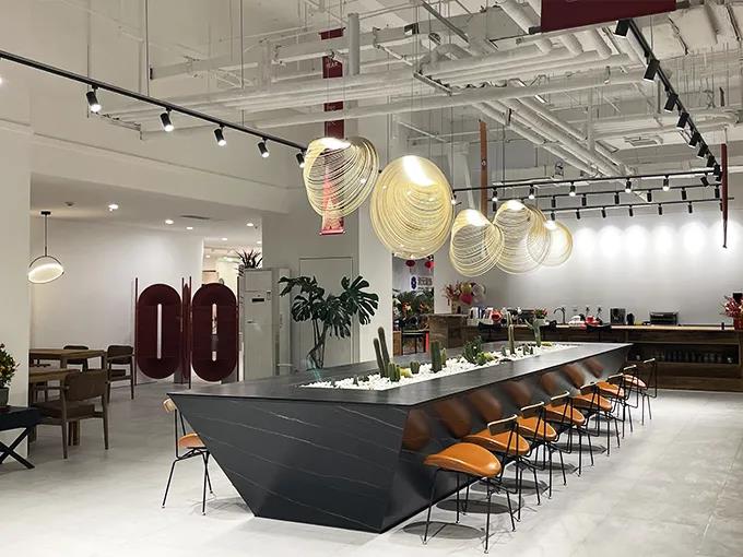 這次展館升級,以中間異形洞口為中心,劃分了三條動線,做了三個分區(qū),分別是洽談區(qū)、主材區(qū)和定制區(qū)。整個洽談區(qū)的改造,設(shè)計師以咖啡廳的整體感覺為設(shè)計來源,吧臺、回形加長導(dǎo)臺、獨立四人位桌椅,設(shè)計師在這里可以和不同家庭結(jié)構(gòu)的業(yè)主朋友們進行輕松、愜意的交流!