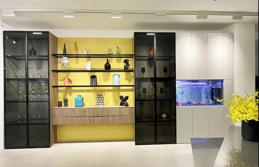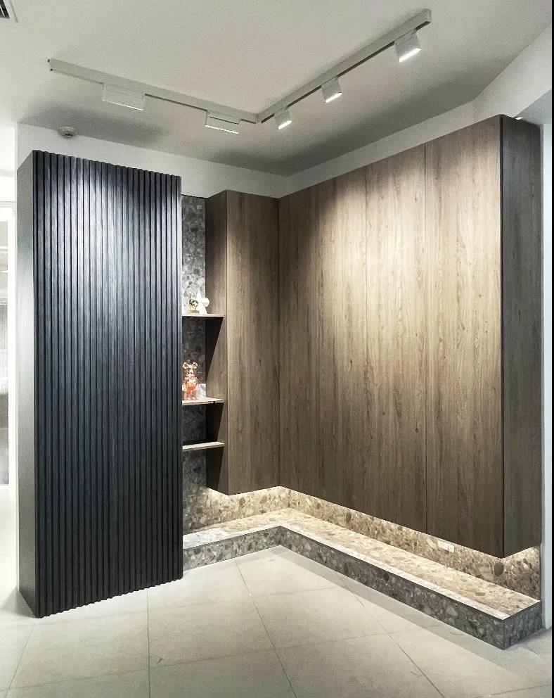 新展廳既有觀賞性玄關(guān)的展示,還有門廳實用性衣帽柜的展示。整體懸掛式設(shè)計,鞋柜、衣柜,展示功能一應(yīng)俱全,兼顧美觀與實用。