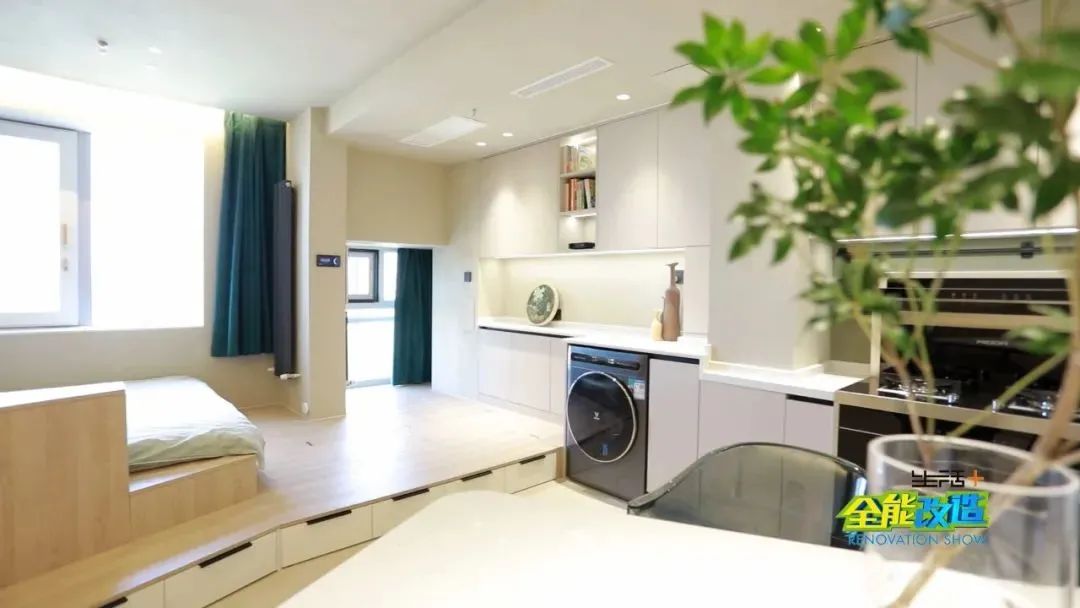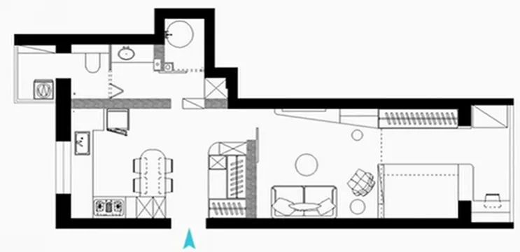 設(shè)計(jì)師賈向楠改變?cè)薪Y(jié)構(gòu)和動(dòng)線,重新規(guī)劃一條斜線異形布局,以島臺(tái)為中心,進(jìn)行U字形設(shè)計(jì)規(guī)劃,讓小戶型各個(gè)功能區(qū)完善的同時(shí),還可以互相借用空間,實(shí)現(xiàn)多功能區(qū)域聯(lián)動(dòng)。