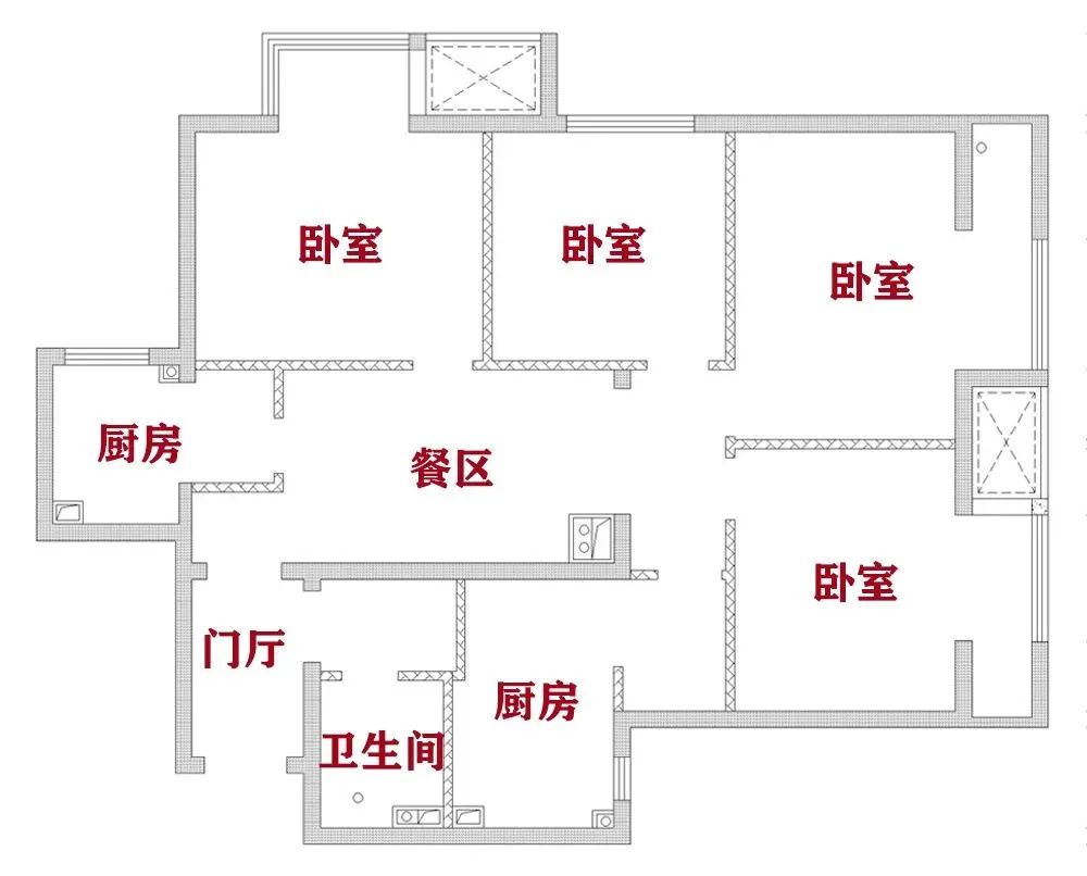 案例三:這套房子,最初是由兩套房子改成的一套四居室,筑面積118平米,三口人居住。