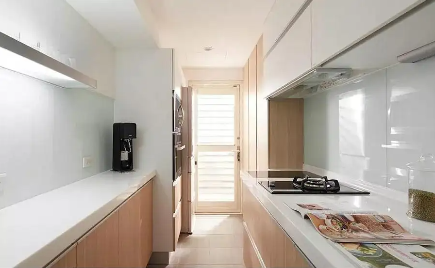 一般面積在4平米左右,寬度在1.5米以下,并且聯(lián)通陽(yáng)臺(tái)的廚房,則建議做一字形櫥柜,結(jié)合業(yè)主的操作習(xí)慣和實(shí)地情況,來布局洗切炒動(dòng)線。如果廚房寬度超過1.6米,則可以選擇一側(cè)做標(biāo)準(zhǔn)櫥柜,而另一側(cè)則可以再做一組薄柜,來增加廚房的收納。如果廚房寬度不夠,則還可以在吊柜上做些文章。