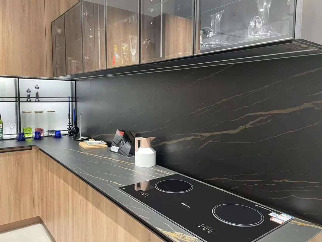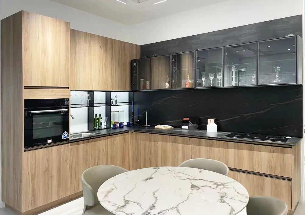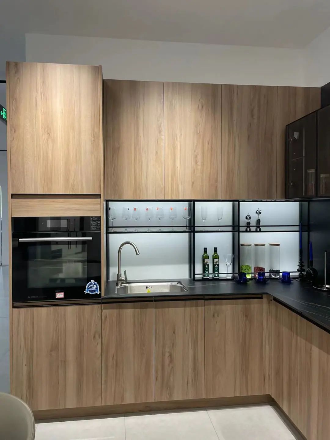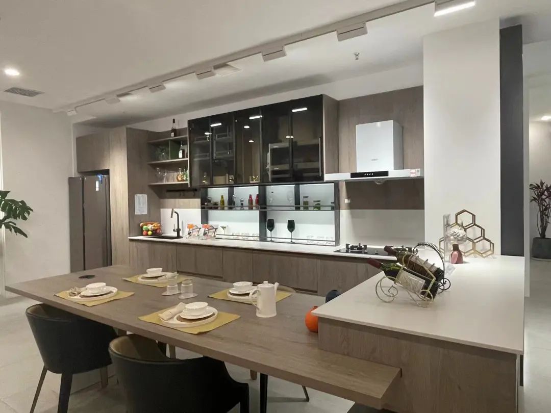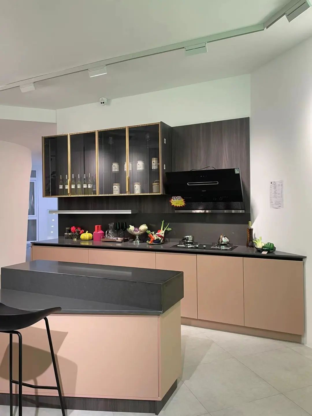 石英石臺(tái)面升級(jí)為了巖板臺(tái)面,更加結(jié)實(shí)耐用、抗污能力更強(qiáng);擋水條升級(jí)成了同色巖板上墻,效果整體,而且好打理;增加了定制高柜,擴(kuò)容了收納;吊柜的雙飾面門板升級(jí)成了玻璃門版,看起來更加通透。