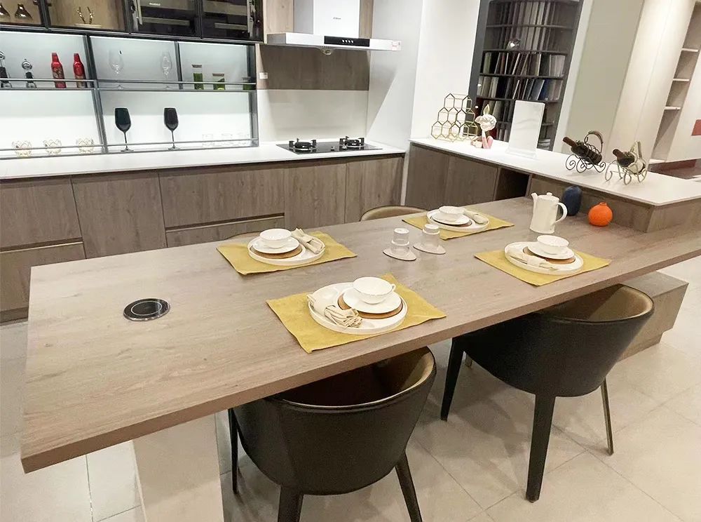這套櫥柜的設(shè)計(jì)適用于廚房空間10到15平米的家庭,或者能接受餐客廚一體的家庭,可以互借空間,增加互動(dòng)感和空間感。這里既是廚房、又是餐廳、還可以兼具工作臺(tái)等多種用途。