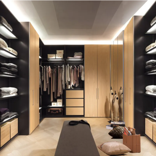 L型衣帽間,就是在一字形的基礎(chǔ)上增加一個轉(zhuǎn)角。衣帽間的寬度至少要在1.2米以上,適合拐角處沒有窗戶的空間。對于拐角處有窗戶的空間設(shè)計衣帽間,為了不遮擋窗戶,也可以將窗下設(shè)計成矮柜加梳妝臺,滿足女主人的梳妝需求。