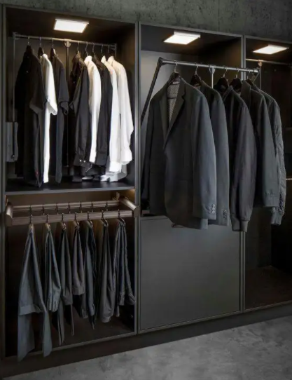 掛衣區(qū)的設(shè)計要考慮到男業(yè)主用的多還是女業(yè)主用的多,還要根據(jù)長短衣的多少來規(guī)劃長衣區(qū)和短衣區(qū)。掛衣桿一字排開,方便拿取,對于位置比較高的區(qū)域可以采用升降式、多功能式的掛衣桿。