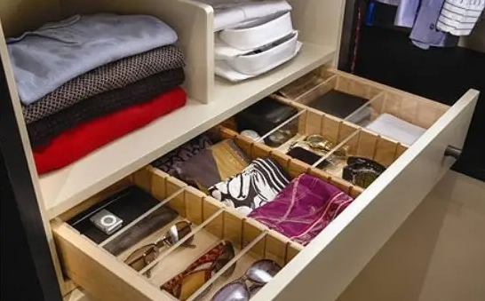 衣帽間本身放的東西就比較多,抽屜這種儲物形式方便又實用,比如存放女士的項鏈、戒指、珠寶等,男士的手表、領(lǐng)帶、領(lǐng)扣等。