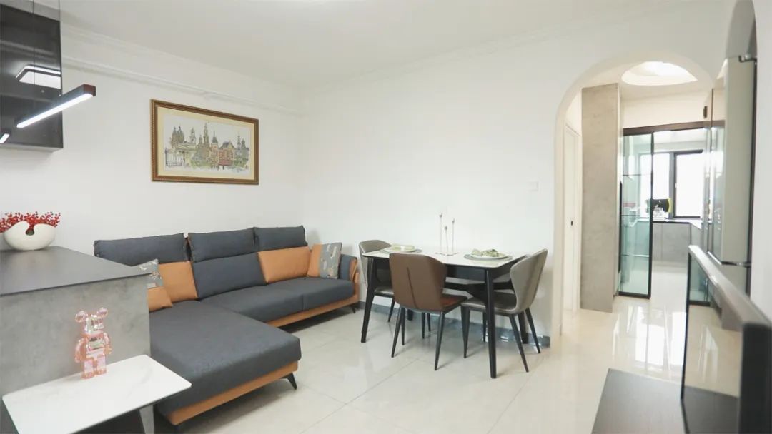 設(shè)計師將客廳與衛(wèi)生間共用的一面墻體重建為了一面Z字型墻體,利用墻體的凹陷空間放置了雙開門冰箱,將四人位沙發(fā)改為三人位后,利用空余的空間為業(yè)主打造了吧臺,吧臺下面的地柜以及吊柜為客廳增加了收納空間。