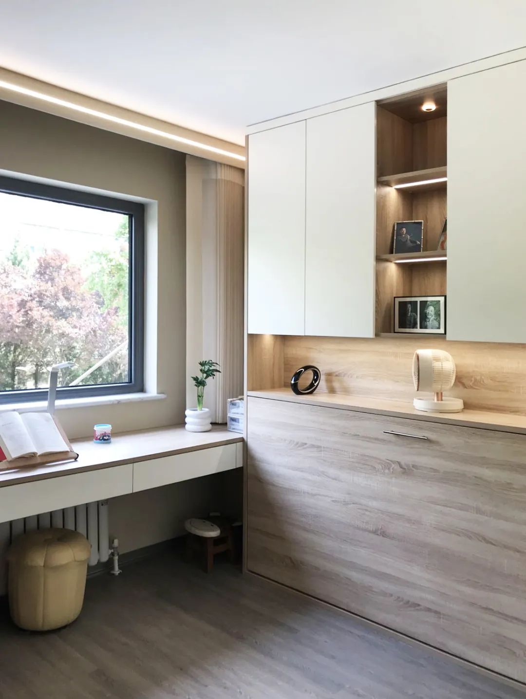 潤元定制家具打造多功能房,3米長的懸空寫字臺,儲物柜及隱藏式壁床,讓這個房間兼具娛樂、讀書學(xué)習(xí)和休息的功能。