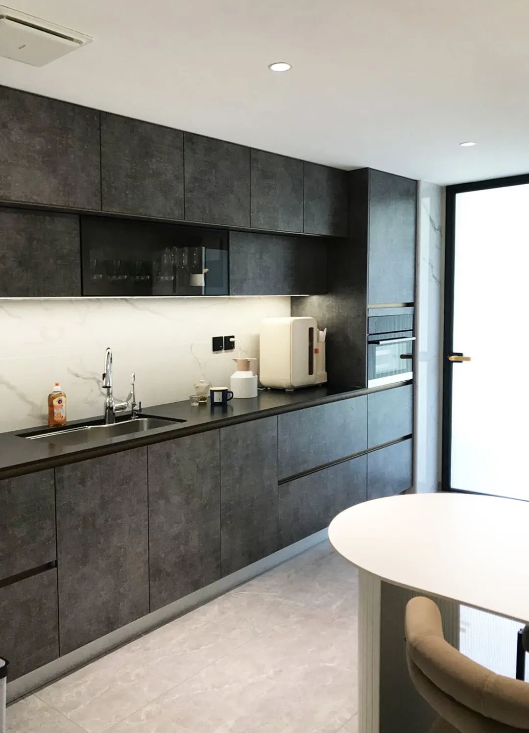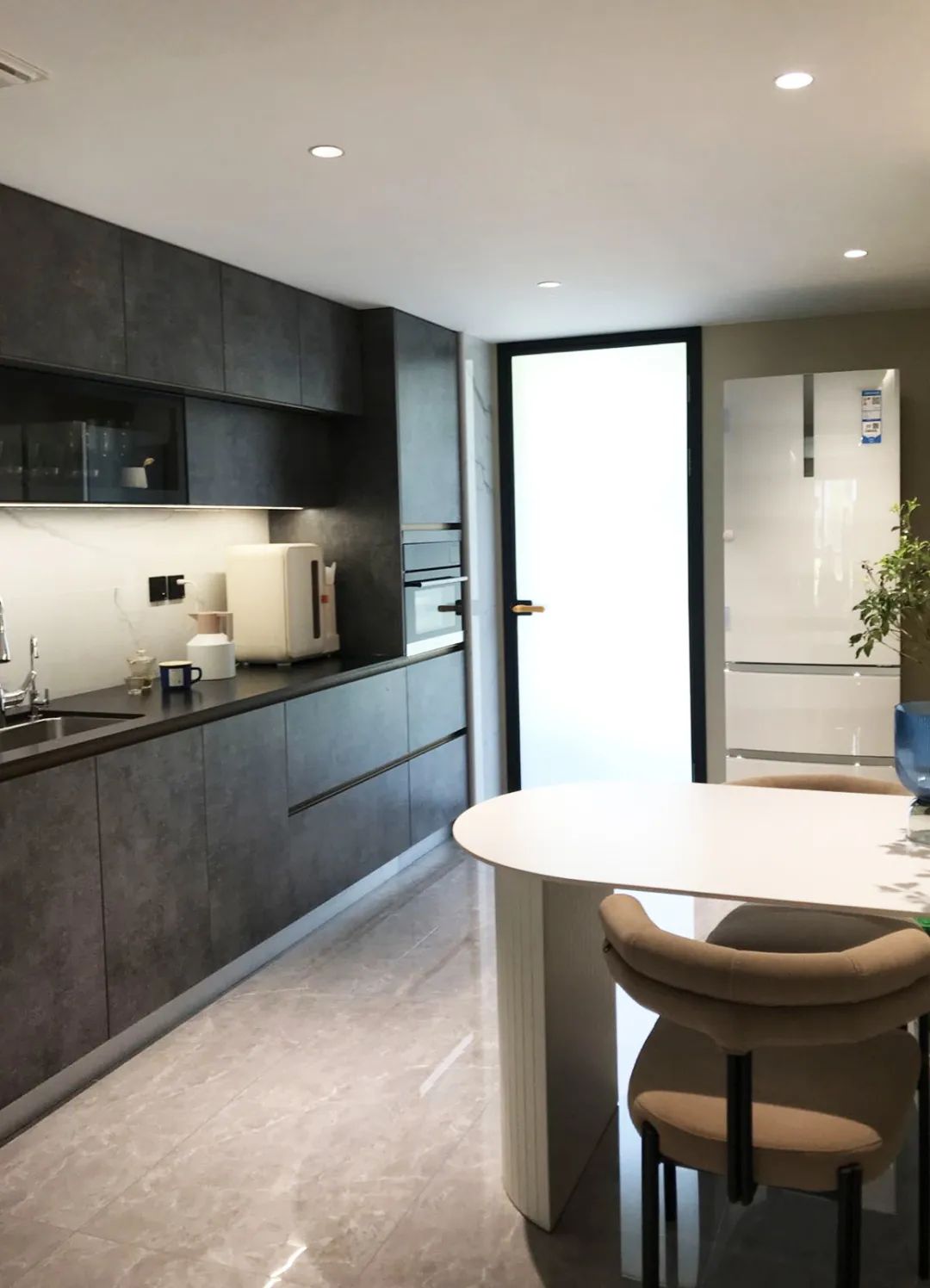 客廳一分為二,一部分擔(dān)當(dāng)會客功能,會客空間整體呈環(huán)抱式,聊天、觀影更為舒適,另一部分為餐區(qū),兼具茶歇和繪畫休閑等功能,整體空間無主燈設(shè)計,點線光源搭配軟裝,時尚前衛(wèi)。