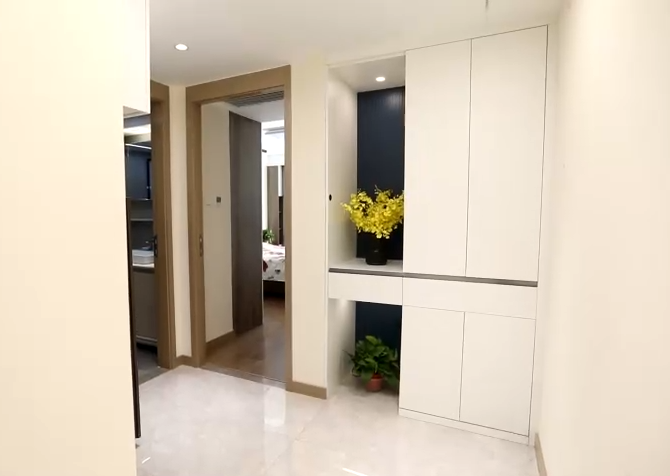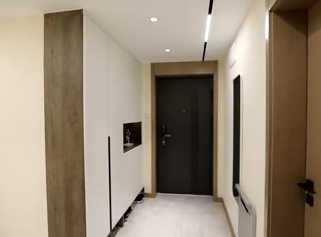 設(shè)計(jì)師擴(kuò)寬了過道空間,將衛(wèi)生間與過道共用的一面墻體向內(nèi)推了40厘米,利用潤元定制家具沿墻體打造一組通頂鞋帽柜,滿足了一家人的儲(chǔ)物需求,頂部利用筒燈結(jié)合磁吸軌道燈的設(shè)計(jì),讓整個(gè)門廳以及過道空間光線更加充足。