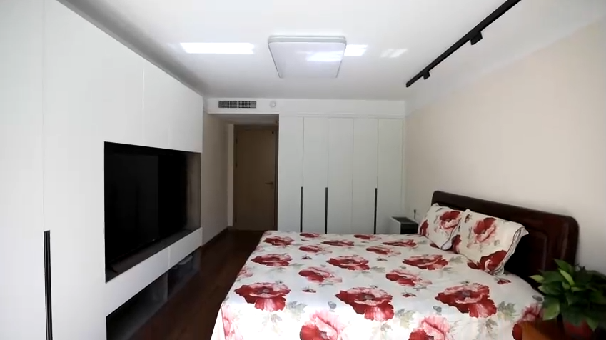 因?yàn)槭且患胰送?,結(jié)合業(yè)主實(shí)際情況,設(shè)計(jì)師將客廳改造為了老兩口的臥室,利用潤元定制家具打造了通頂衣柜以及電視柜,主臥陽臺(tái)也打造了定制柜來滿足對(duì)儲(chǔ)物空間的需求。