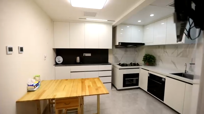 一組多人位的可拉伸餐桌,方便又實(shí)用,在廚房拐角處懸掛電視,這個(gè)空間又具備了客廳的功能,滿足了一家人觀影,休閑的需求。