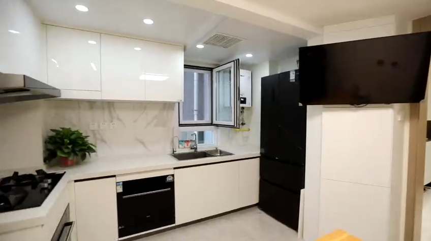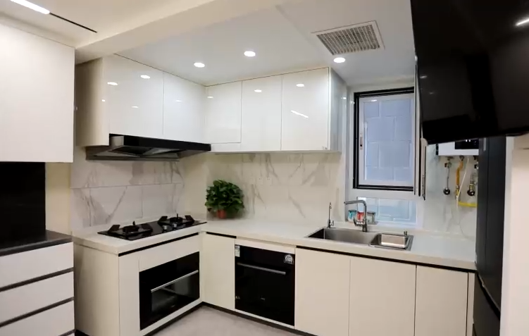 設(shè)計(jì)師借用了部分次臥空間給到了餐廚,一組L型櫥柜,洗切炒動(dòng)線合理,操作方便。同時(shí),又在櫥柜旁邊利用定制家具打造了一組通頂餐邊柜來補(bǔ)充廚房儲(chǔ)物。