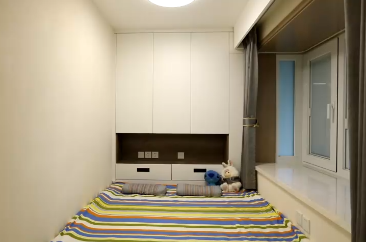 設(shè)計(jì)師將原本的臥室和儲(chǔ)物間規(guī)劃為了現(xiàn)在雙胞胎的臥室,里面利用定制家具打造了一整排榻榻米和儲(chǔ)物柜,學(xué)習(xí)桌依次擺放,滿足了兩個(gè)孩子的居住需求。