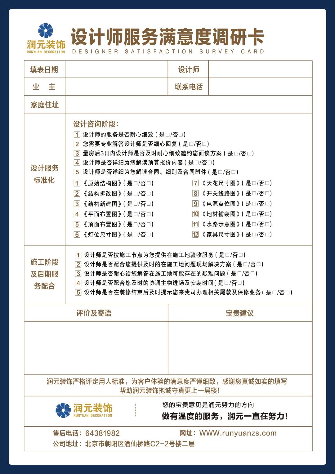 第四是為每戶業(yè)主準(zhǔn)備了一張?jiān)O(shè)計(jì)師評價(jià)表,對設(shè)計(jì)師在裝修前,裝修中和裝修完成后的每個(gè)階段進(jìn)行評分,不滿意比例達(dá)到20%或30%,潤元就會提出警告和停單,或者是進(jìn)行勸退的舉措,同時(shí)還有一份潤元設(shè)計(jì)師公約,對所有的項(xiàng)目都有明確要求,設(shè)計(jì)師要為自己的行為和設(shè)計(jì)工作負(fù)責(zé)。