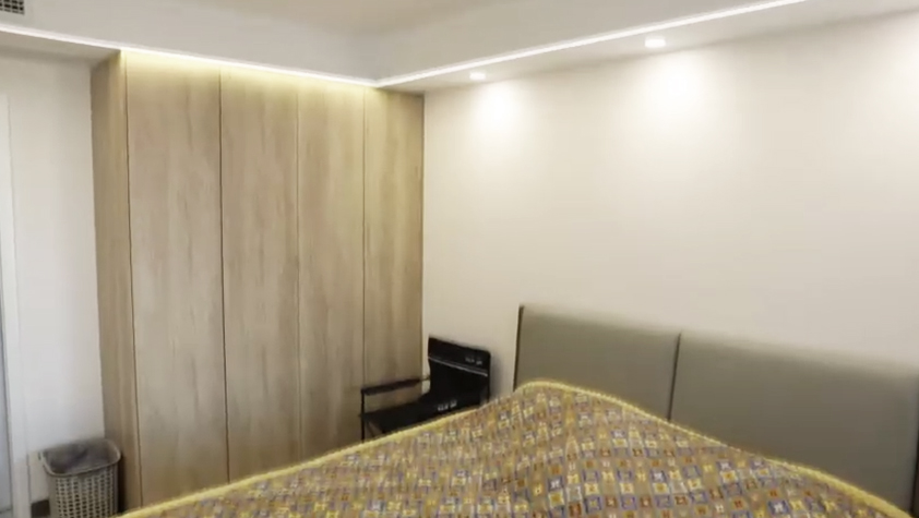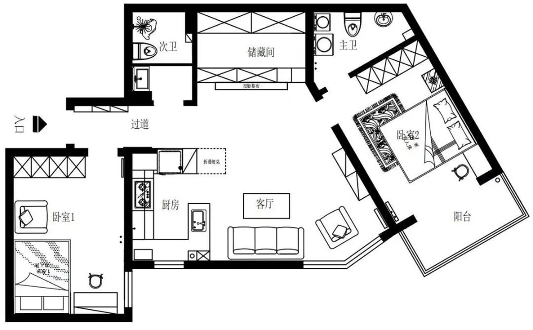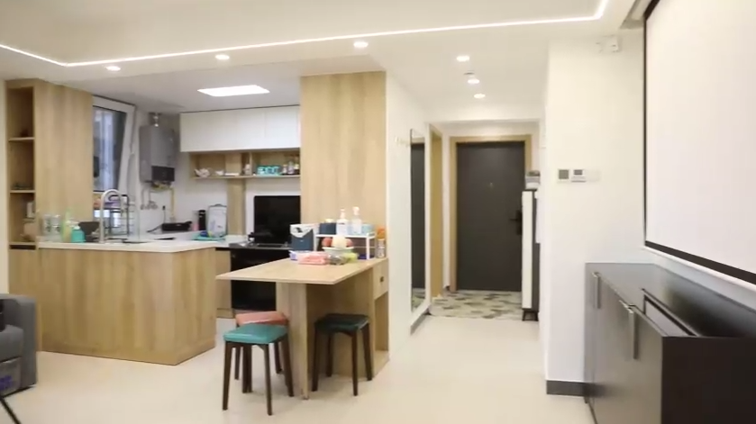 設(shè)計(jì)師將原來餐區(qū)的位置規(guī)劃了一個(gè)儲(chǔ)藏間,為了與客廳更好的融合,儲(chǔ)藏間的門,用柜體做成了隱形門,投影隱藏在這面墻上面,家里實(shí)現(xiàn)了投影的設(shè)計(jì)。