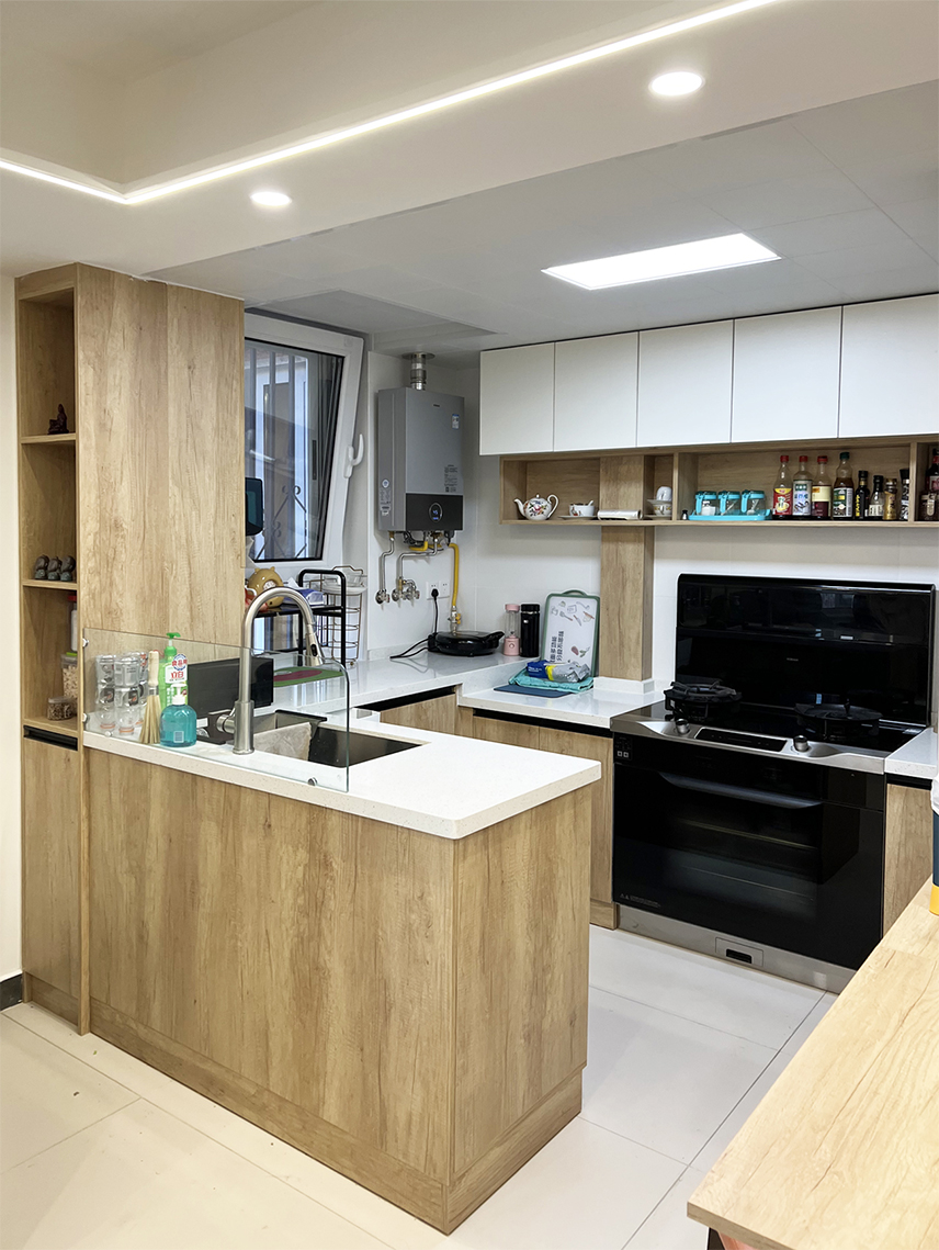 設(shè)計(jì)師拆除了原廚房和客廳共用的一面輕體墻,改為了開放式廚房,并且將整個(gè)空間規(guī)劃為了餐廚一體空間,廚房面積擴(kuò)大后,將原來的L型櫥柜改為了U型櫥柜,增加了儲(chǔ)物收納,一組高低柜,放置冰箱和折疊餐桌,用餐更方便。