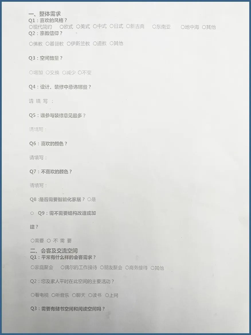 在這個階客戶到店后,首先我們會有一個81項的客戶情況調查表先讓業(yè)主填寫一下,通過調查表了解一下客戶基本情況,比如家庭結構,生活習慣,風格喜好等等。段一般咨詢的客戶分為兩種情況,一種是打客服熱線來咨詢的客戶,另一種是到店和設計師面對面咨詢的客戶。