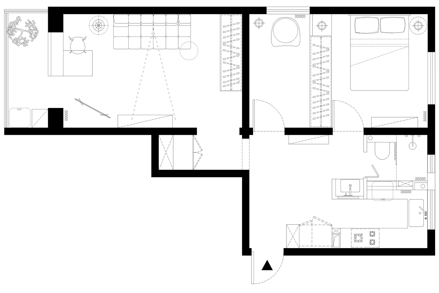 客廳打破傳統(tǒng)的電視、沙發(fā)的正對布局,采用去中心化的布局方式,滿足客廳的休閑、會客、辦公、儲物等多種功能。