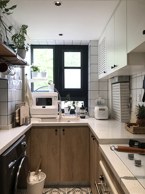 廚房改為開放式,延伸至門廳,空間由原來的3平米擴(kuò)到到現(xiàn)在的將近6平米。U形的廚房布局,洗切炒動線合理,操作空間寬敞。通過尺寸的精準(zhǔn)排布,洗衣機(jī)、廚房小家電也都找到了合適的位置。