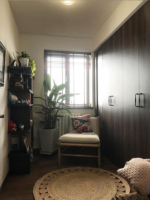 朝北的這間作為主臥室,但是因為只有8平米,所以借用了一部分次臥的空間,同時用定制家具作為這兩間臥室的隔斷,分隔主臥室與書房,節(jié)省了空間。使用風(fēng)管機(jī)代替掛式空調(diào),用吊頂把管道、風(fēng)管機(jī)設(shè)備都藏起來。風(fēng)格上,亞麻、胡桃、綠植等材質(zhì)運用,來營造南洋復(fù)古風(fēng)。