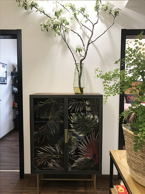 門廳面積9平米,設(shè)計師將部分門廳空間分配給了廚房和衛(wèi)生間,入戶空間一組通頂?shù)膬ξ锕駚頋M足進(jìn)門儲物。