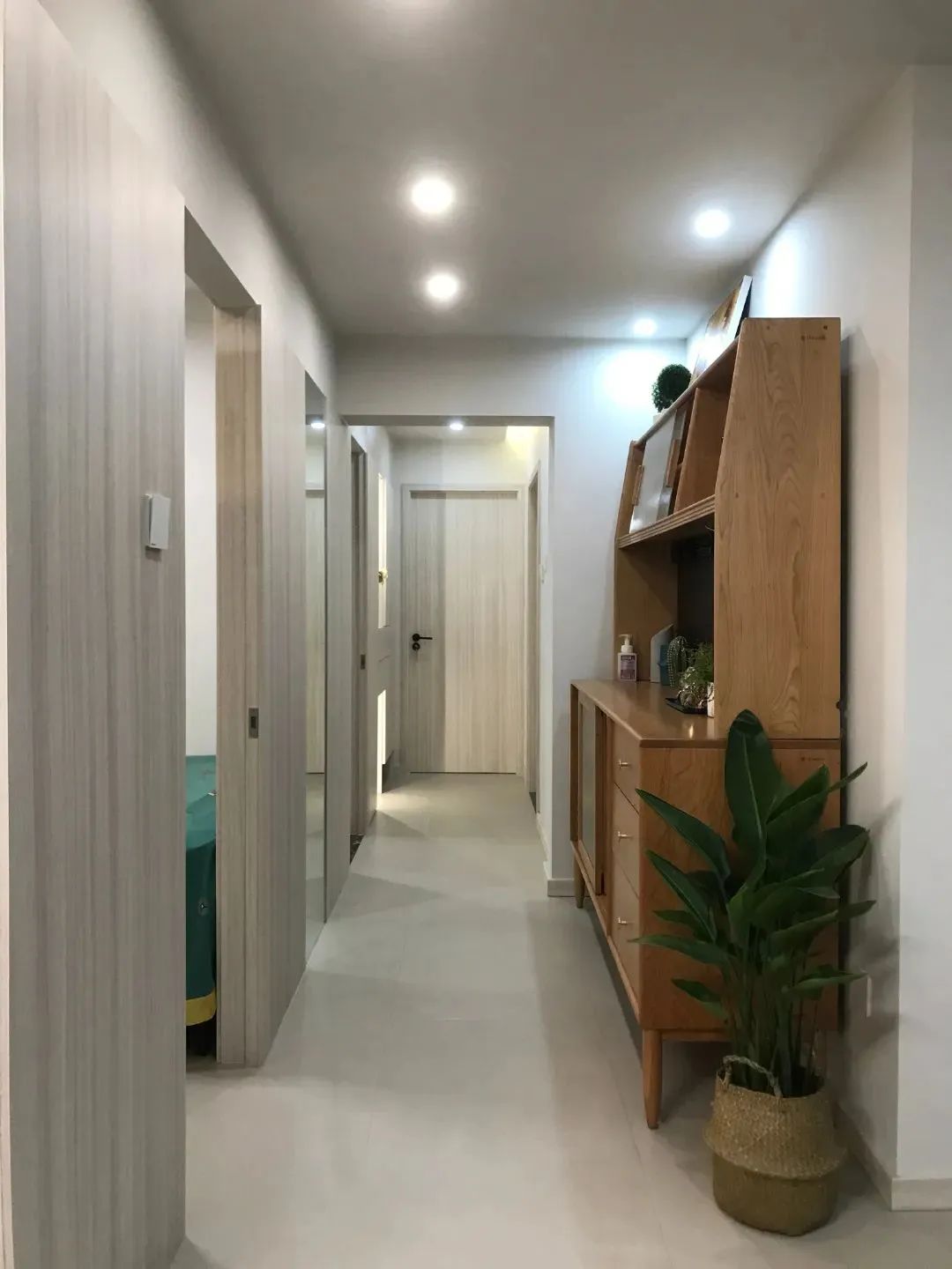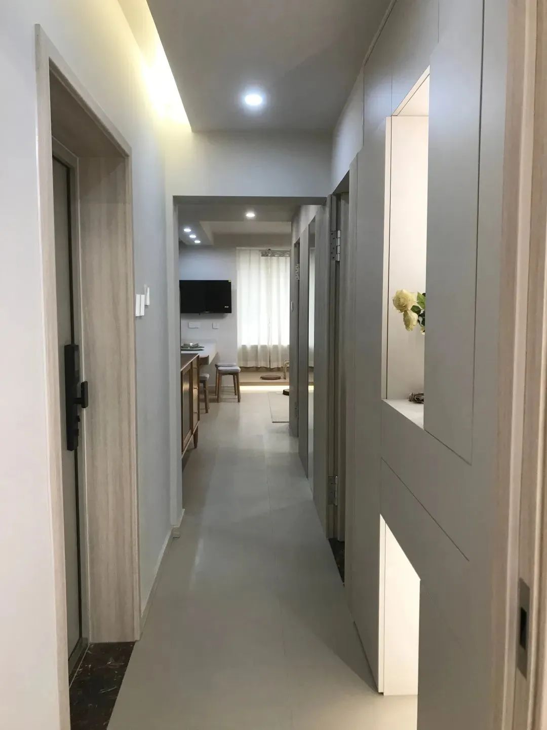 設計師通過往里推衛(wèi)生間的一面墻,再挪移衛(wèi)生間、主臥室的兩扇門,實現(xiàn)了業(yè)主想要的門廳空間了,定制鞋帽柜儲物量驚人,細節(jié)上,門廳做了吊頂,加了筒燈,側(cè)邊15厘米處還有反光燈槽,燈光更加柔和。