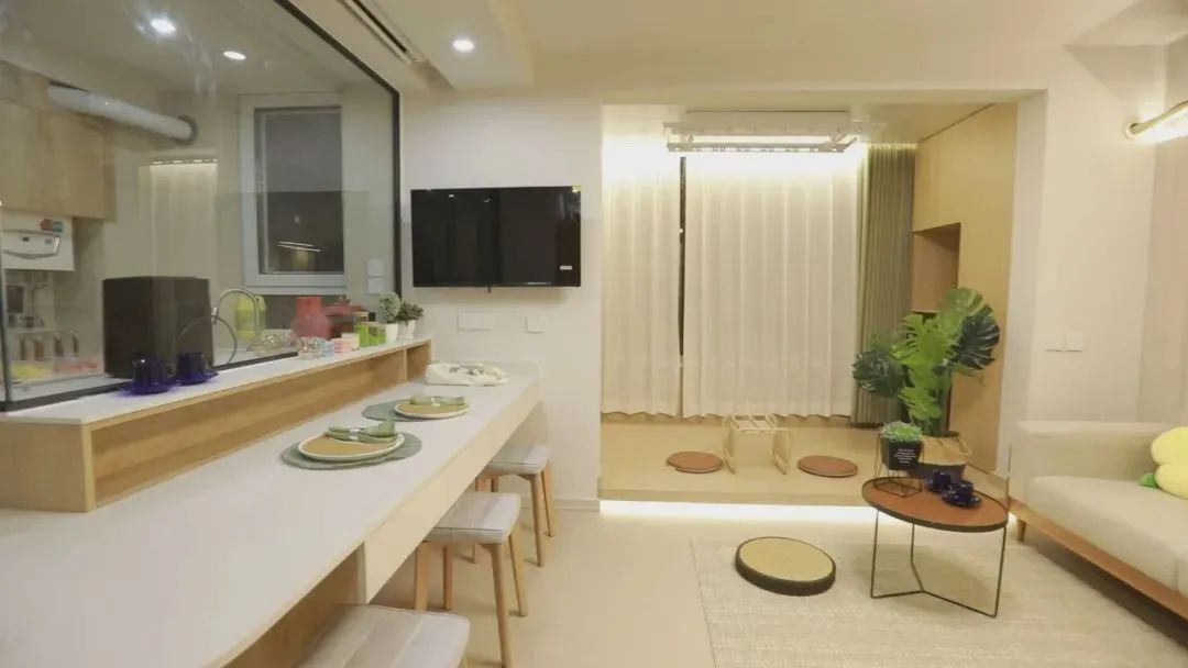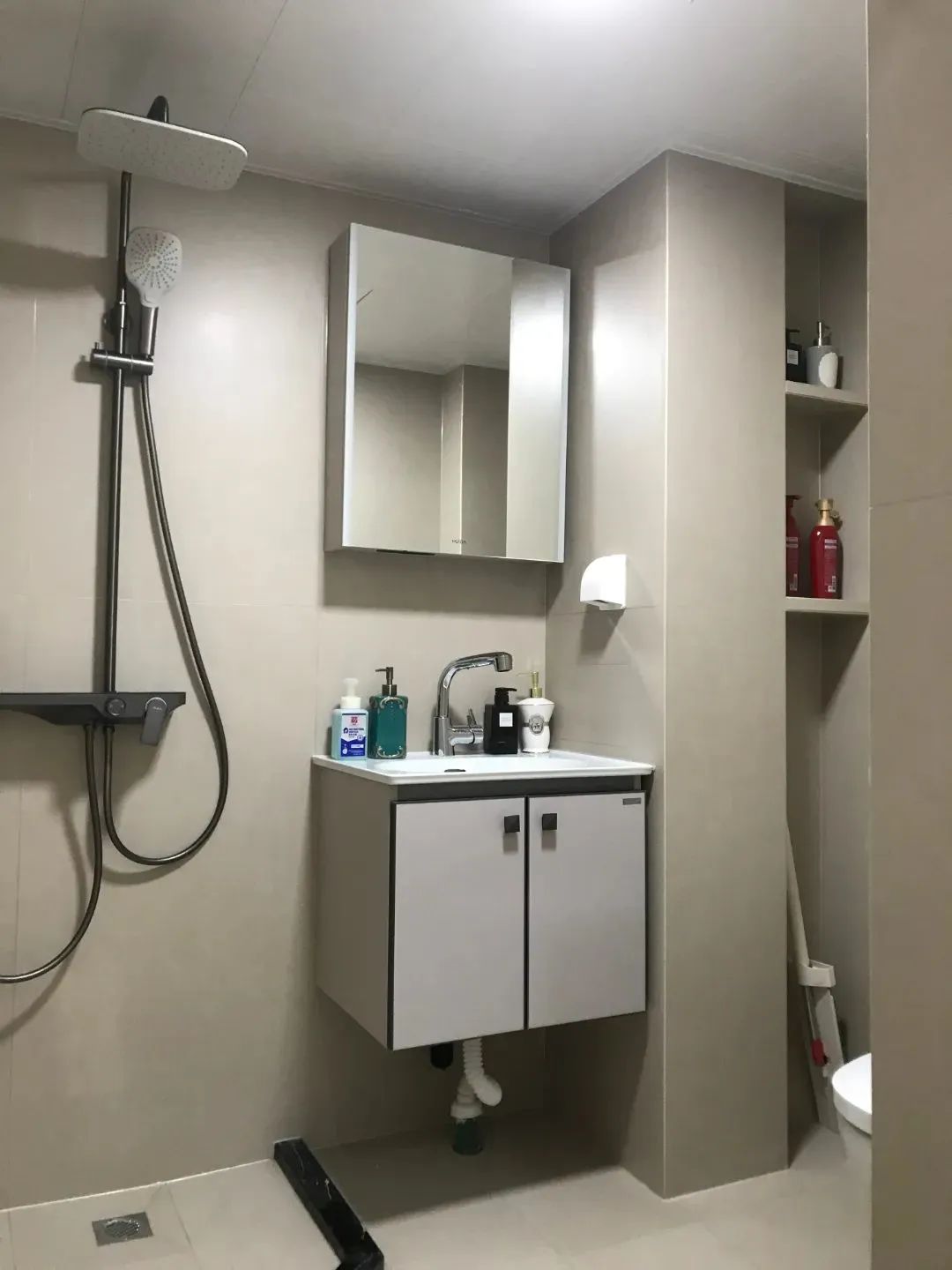 一個人居住的情況下,至少得8平米的空間,但因為面積的原因設計師把這個空間已經(jīng)壓縮到最小了。