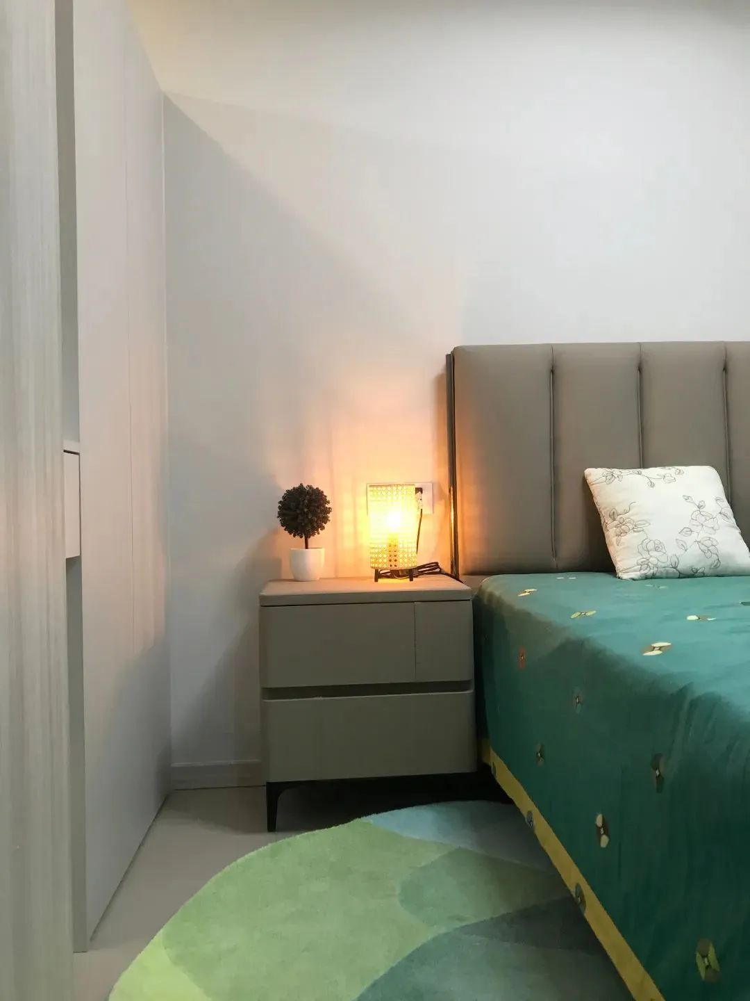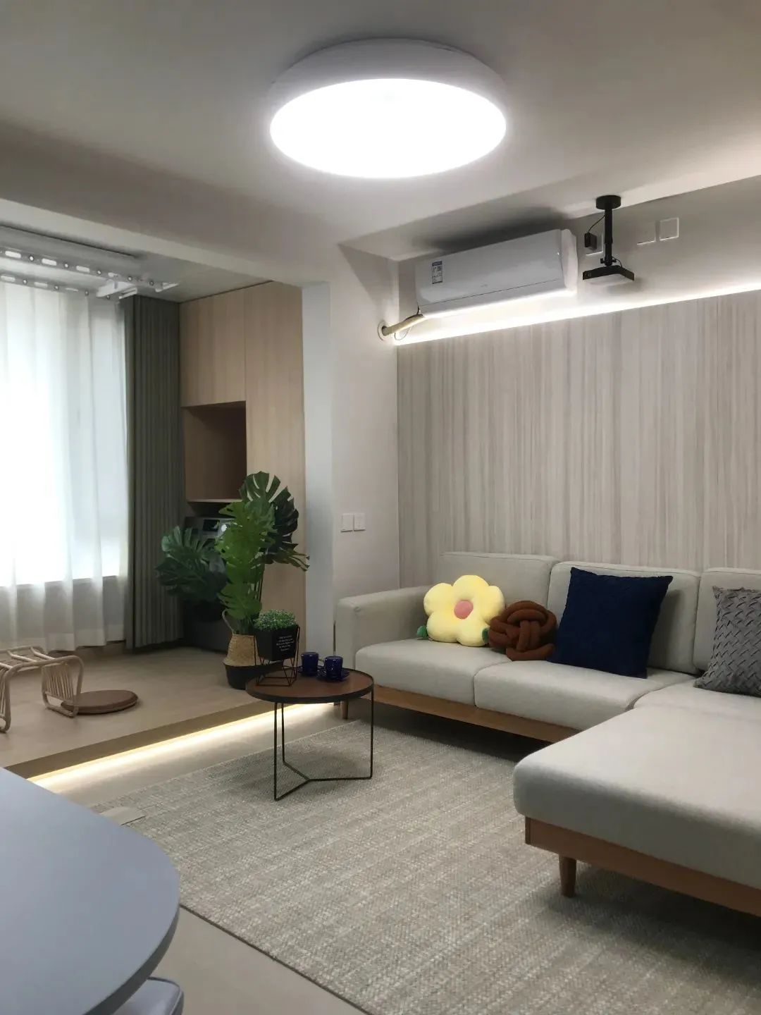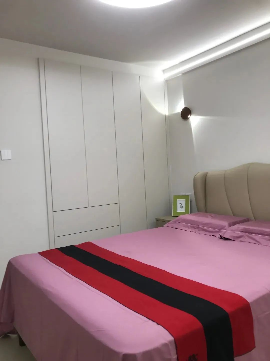 臥室的門往里推了60厘米,新砌的墻體在臥室形成一個內(nèi)嵌空間,做了兩組定制衣柜。頂面的主燈,以及燈帶,設計師也是考慮兩個人起居特點,做了特別的設計!