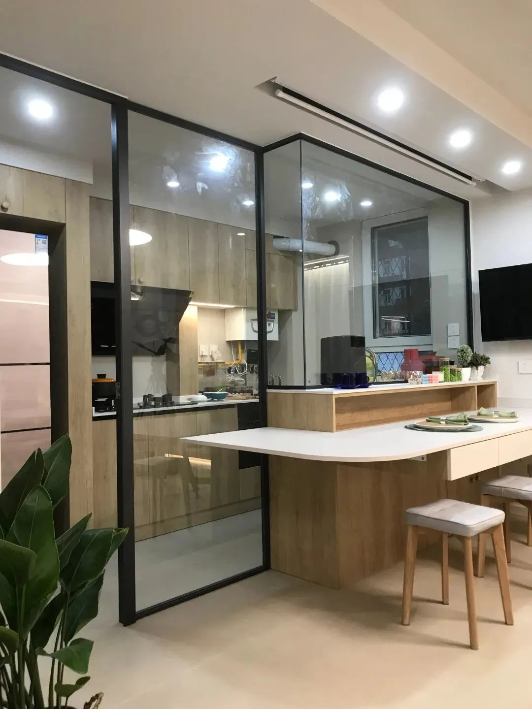 將廚房原來的墻體全部拆除,廚房面積一下大了,廚房是半開放式,下面是墻體,上面是一整面的玻璃,與玻璃相連的是一個轉(zhuǎn)角的吧臺,可以作為多功能的導臺使用。