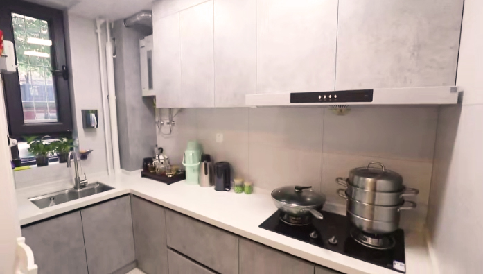 把廚房與小客廳之間的這面墻拆掉,廚房變成開放式,形成餐客廚一體化的設(shè)計(jì),融合后整個(gè)空間面積達(dá)到10.7平米。廚房一組L形櫥柜,洗、切、炒動(dòng)線合理,儲(chǔ)物充足。