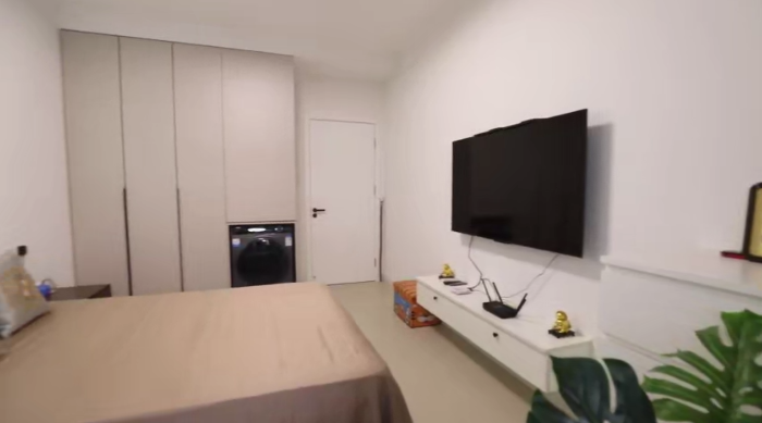 拆掉陽臺(tái)的推拉門,讓主臥室與陽臺(tái)連通,采光更好了。陽臺(tái)作為晾曬、休閑區(qū),做了地臺(tái)的設(shè)計(jì),平時(shí)在這里可以曬曬太陽;一側(cè)還做了儲(chǔ)物柜,來增加儲(chǔ)物空間。主臥室里1米8的雙人床居中擺放,兩邊床頭柜,對(duì)面放置電視,靠墻定制了一整面的衣柜,儲(chǔ)物空間充足。