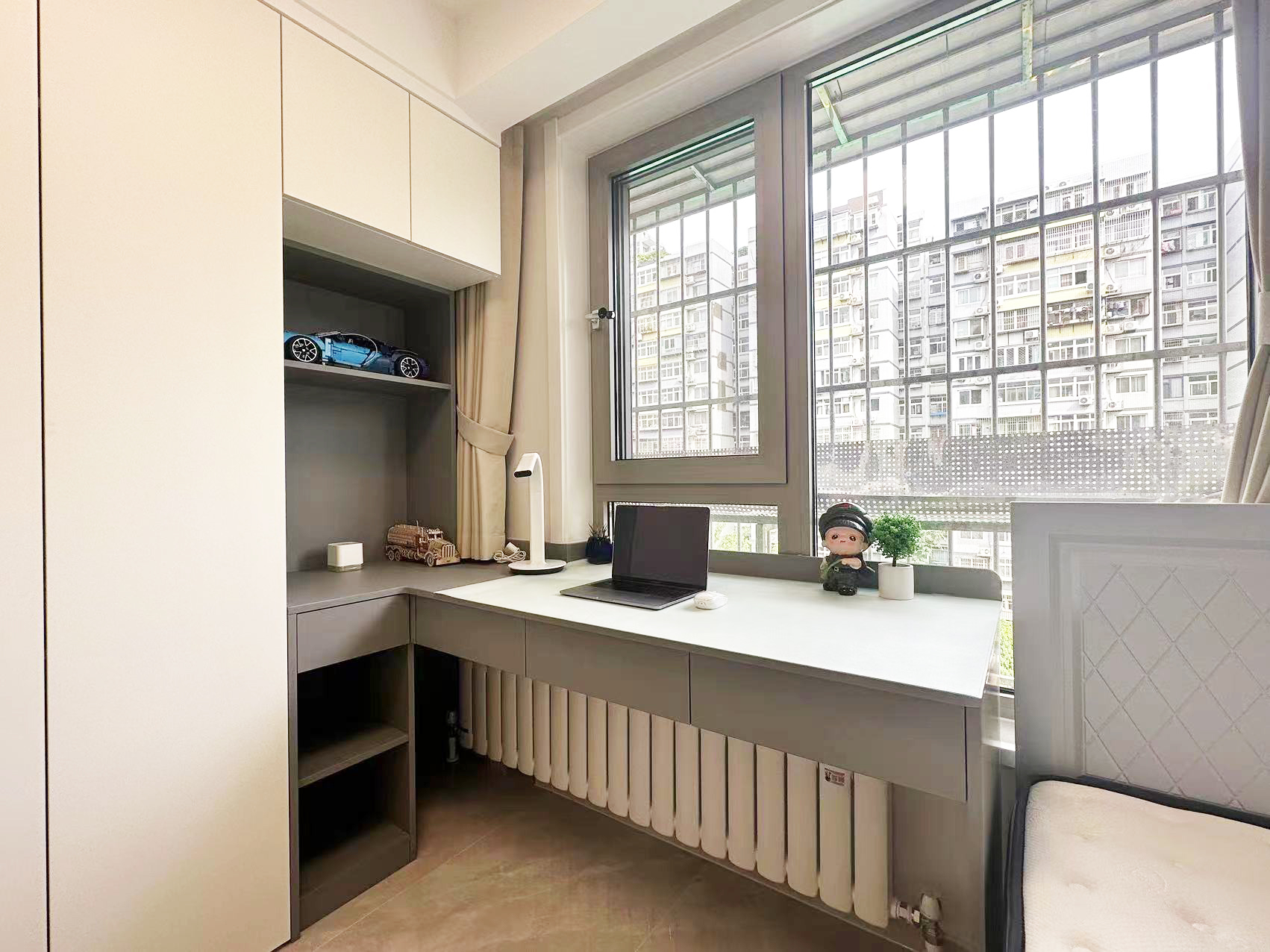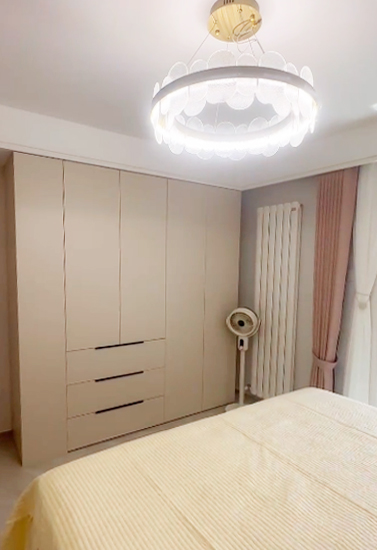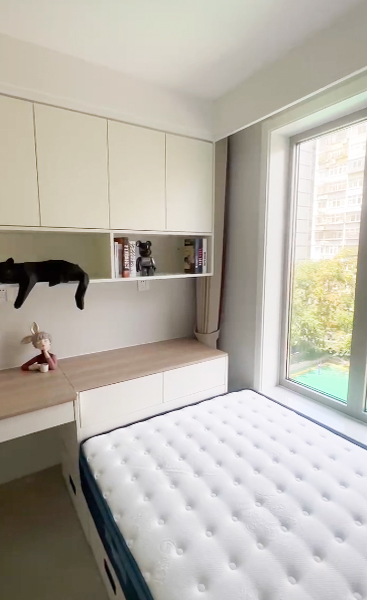 設(shè)計(jì)師在客廳距離窗戶兩米二的位置新建墻體,為業(yè)主規(guī)劃出了一個(gè)面積6平米的第三居室,解決了一個(gè)孩子休息學(xué)習(xí)和儲物的需求。