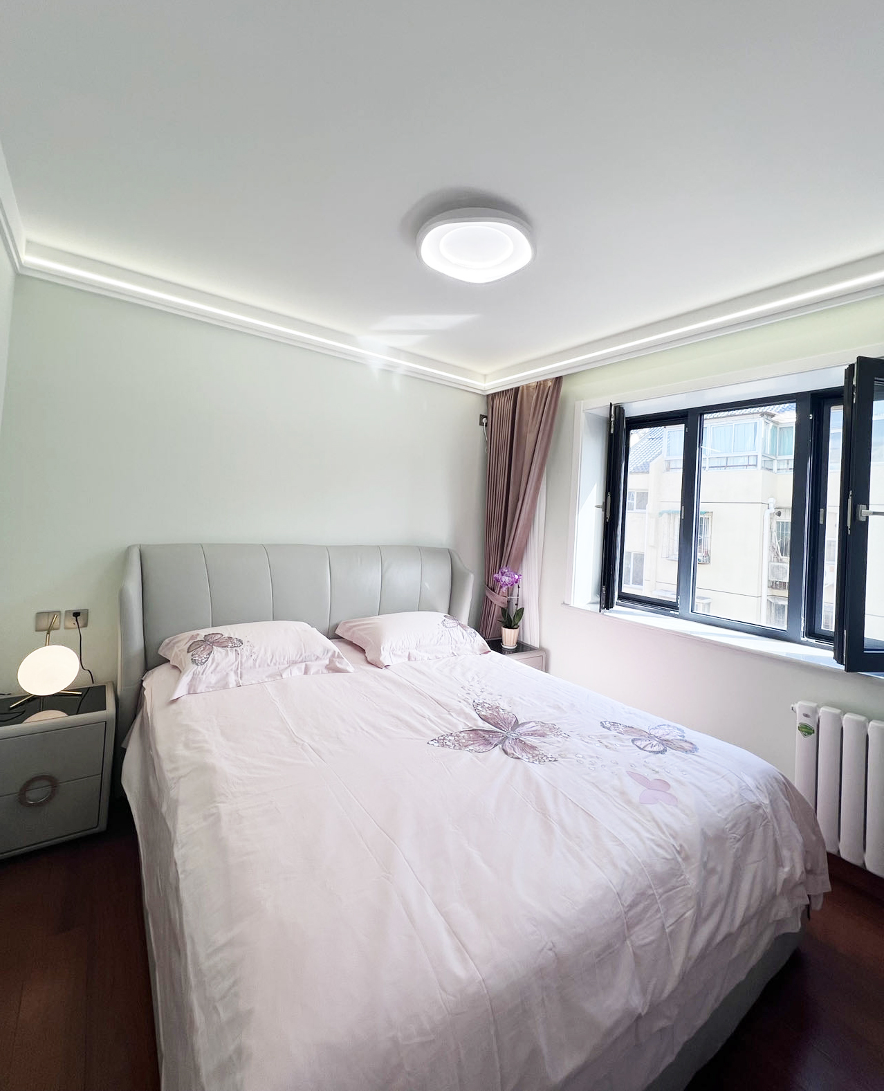 主臥10平米,房間比較方正,雙人床、兩個(gè)床頭柜居中擺放,對(duì)面墻整體做了定制衣柜,滿足衣物收納,頂面裝飾了雙眼皮加線性燈,拉高了空間,墻面淡綠色,給婚房氛圍憑添了雅致、溫馨感。
